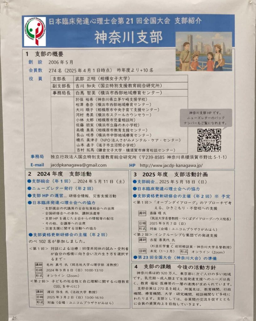 神奈川支部会員は270名を超え、所属先は教育機関、行政機関、療育機関、大学・研究機関、相談機関など多岐に渡ります。ポスター発表では、2024年度は、支部総会や支部ホームページの運営等に加え、オンラインと対面の2回の支部研修会を企画したこと、2025年度も同様に支部研修会の企画等を行う他に、第23回全国大会(神奈川大会)に向けた準備を進めていることをご紹介致しました。
