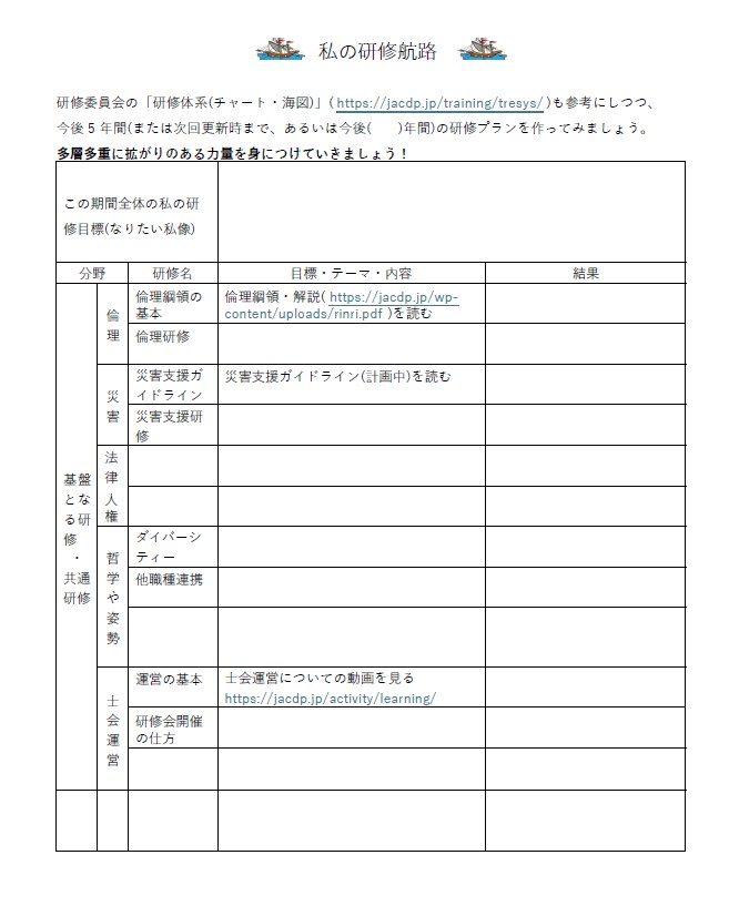 日本臨床発達心理士会では、必ず受講しなければならない必修の研修会はありません(ただし、新会員には入会後1~2年に基礎的研修を受講することをお勧めします)。会員一人一人で携わっている臨床活動、臨床経験、能力などが異なっていることと思います。そのため、自分の職能職域においてどのような知識や技能が必要か、自分が備えるべき資質は何かを自ら把握し、それに合わせて自分で研修計画を立てることが望ましいと考えるからです。研修体系を「海図」に見立て、その中で自身の研修計画を「海図に引く航海図」となぞらえて「私の研修航路」という用紙を作成しました(このページの下部。ここをクリックすると飛べます)。研修・研鑽の対象は士会の資格更新研修会に限りません。ご自身の研鑽を積む計画を作る際の参考にしていただければと思います。